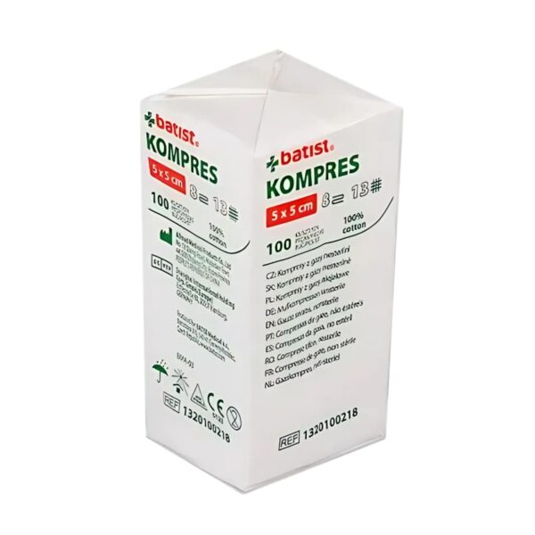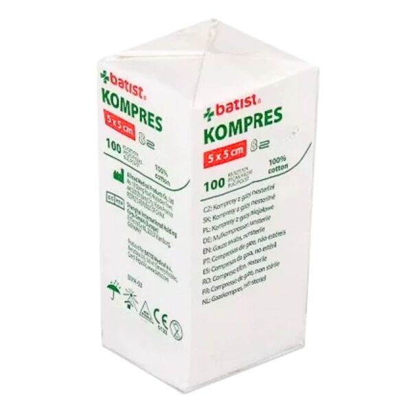 Kompresy gazowe niejałowe z bawełny bielonej bez chlorowo, złożone z warstw z brzegami podwiniętymi. Dzięki temu eliminowane jest ryzyko wysuwania się luźnych nitek.
