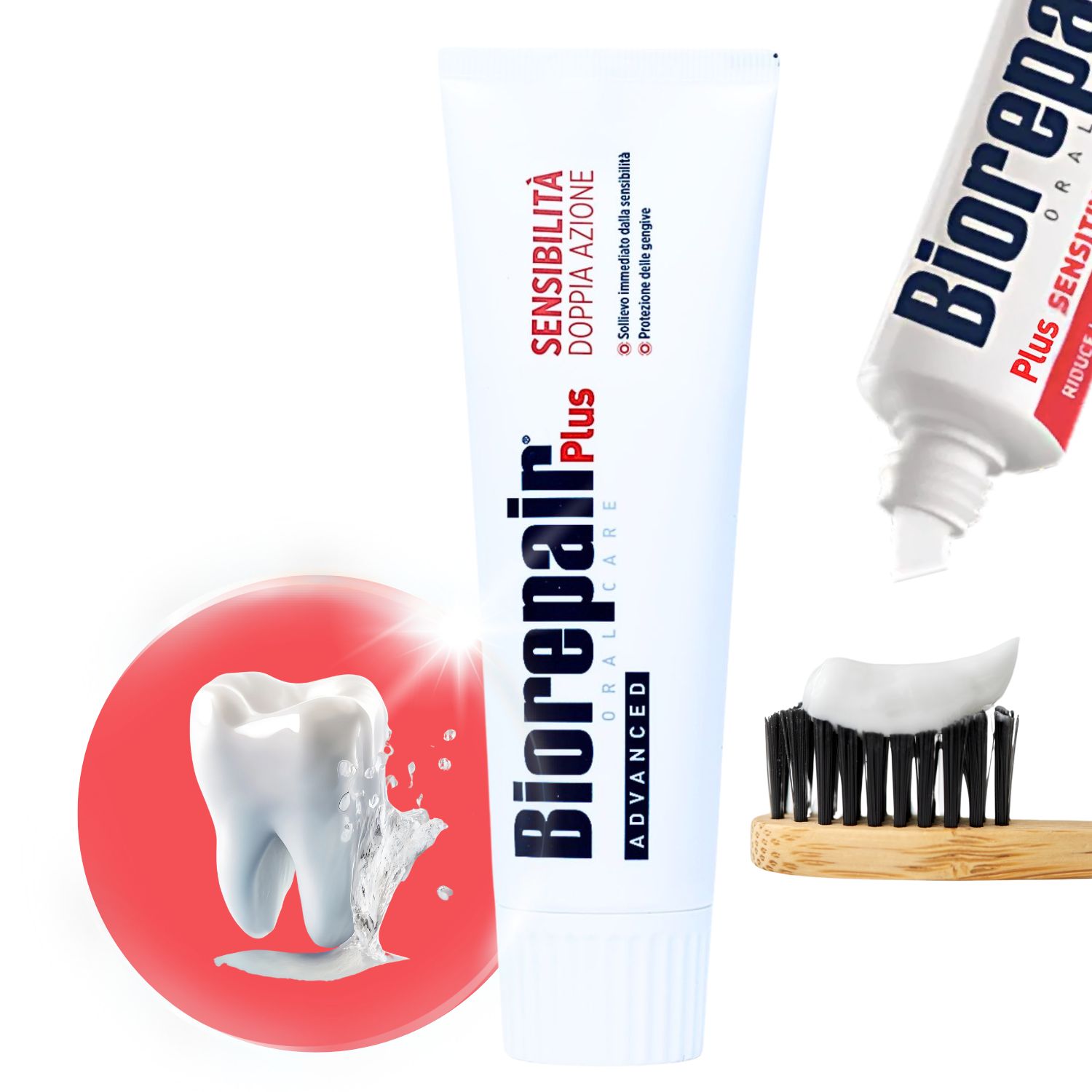 Biorepair® Plus Advanced Sensitivity Double Action to zaawansowana formuła Biorepair® Plus, która pomaga zwalczać nadwrażliwość i chronić dziąsła. Dzięki wysokiemu stężeniu microRepair® wynoszącemu 240 mg/g zapewnia natychmiastową ulgę w bólu spowodowanym nadwrażliwością i długotrwałą ochronę. Formuła wzbogacona o ksylitol, CPC i mastyks Chios zapewnia ochronę i zdrowie dziąseł. Uszkodzone szkliwo i cofające się dziąsła to dwie przyczyny nadwrażliwości zębów. Kwaśne pokarmy i zużycie mechaniczne (np. szczotkowanie) powodują stopniowe niszczenie szkliwa. Płytka bakteryjna gromadząca się na linii dziąseł może powodować stan zapalny i recesję błony śluzowej, odsłaniając wrażliwe kanaliki zębinowe znajdujące się w zębinie, które prowadzą do nerwów zębów. Gorące, zimne lub słodkie substancje nie znajdując żadnej bariery, wchodzą w kontakt z nerwami, powodując dokuczliwe kłucia, które stają się coraz bardziej bolesne.