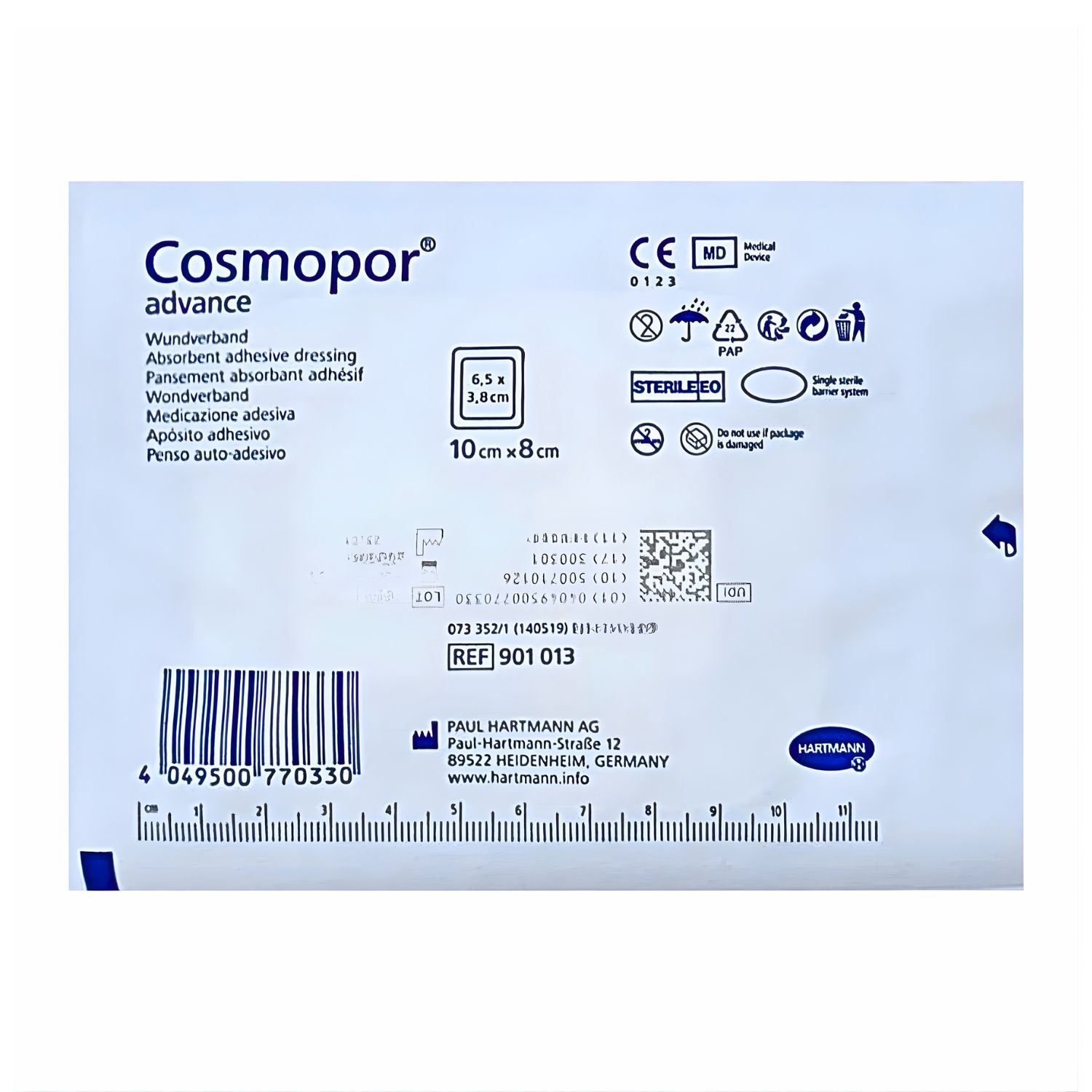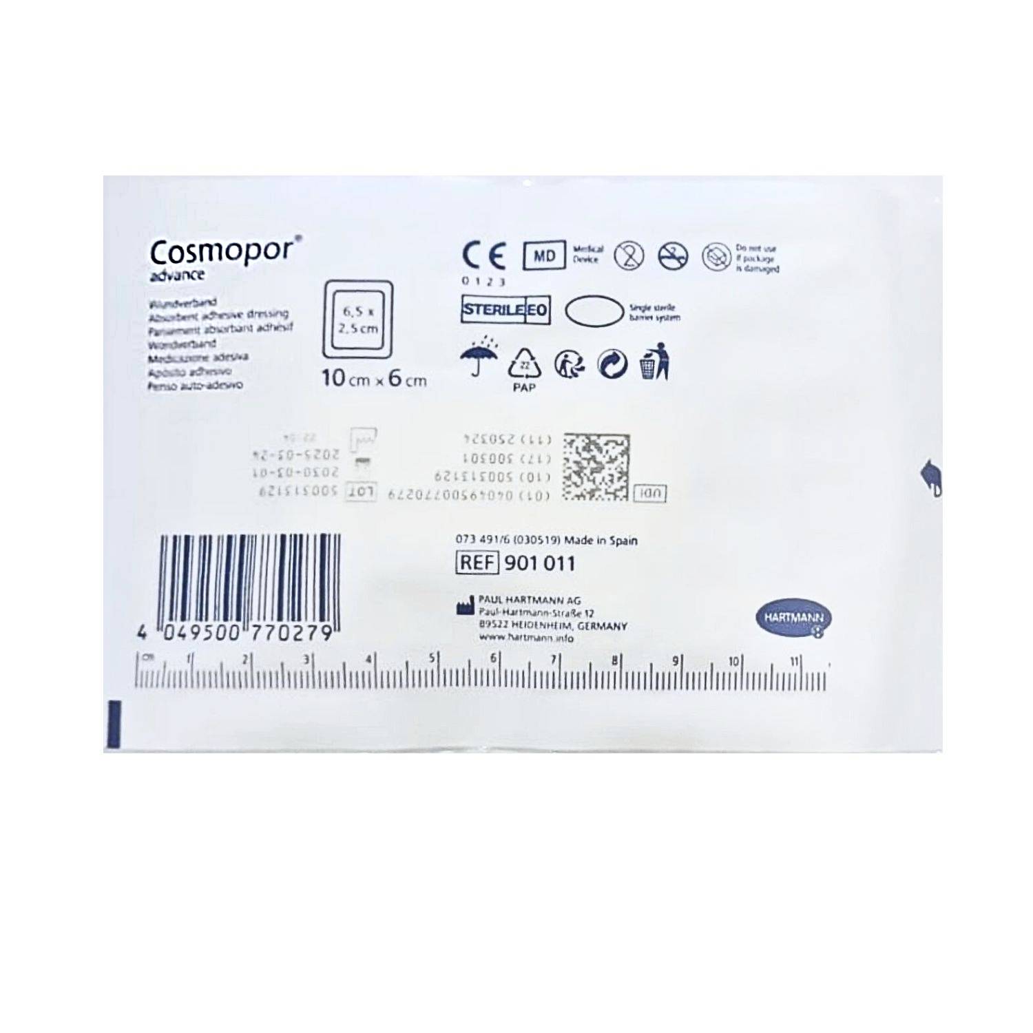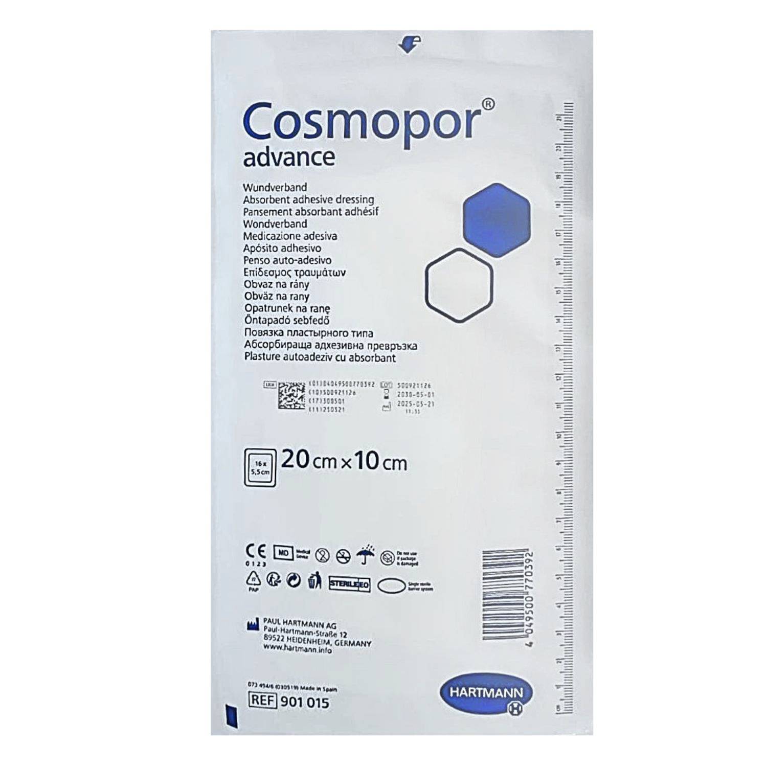 Hartmann Cosmopor Advance super chłonny, samoprzylepny opatrunek na rany, wykonany z miękkiej włókninowej warstwy z wykorzystaniem technologii DryBarrier®; warstwa stykająca się z raną wykonana jest z siatki z drobnego polietylenu zapobiegająca przywieraniu do rany; Zastosowanie technologii DryBarrier® sprawia, że wysięk i wilgoć z rany odprowadzane są jednokierunkowo do warstwy chłonnej; posiada bardzo wysokie zdolności absorpcyjne nie pozwalające na wydostanie się wysięku na zewnątrz ani na cofanie do pozostałych warstw opatrunku; przyjazny dla skóry dzięki hipoalergicznemu, syntetycznemu kleju.