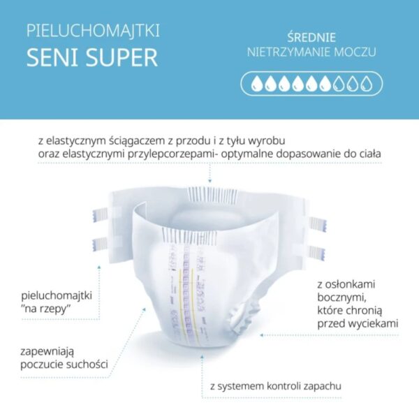Pieluchomajtki Super Seni to klasyczny wyrób chłonny, przeznaczony dla osób dorosłych – przede wszystkim leżących lub potrzebujących pomocy opiekuna. Odpowiedni w przypadku średniego nietrzymania moczu.