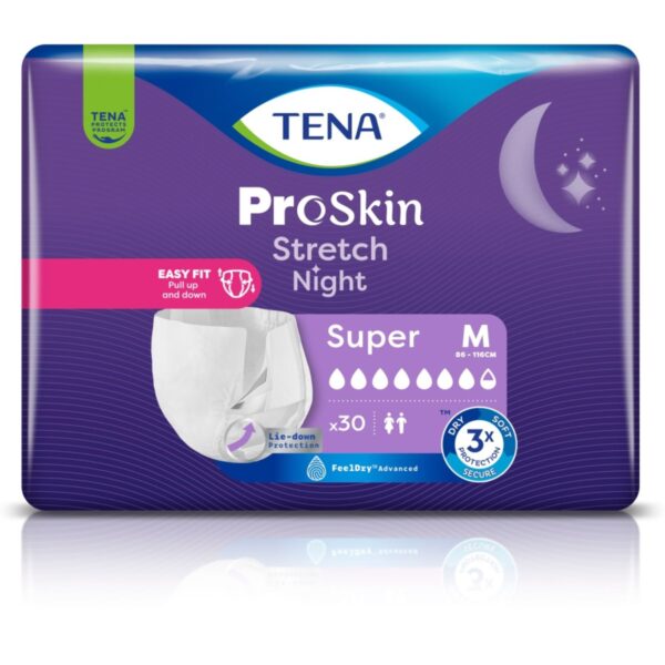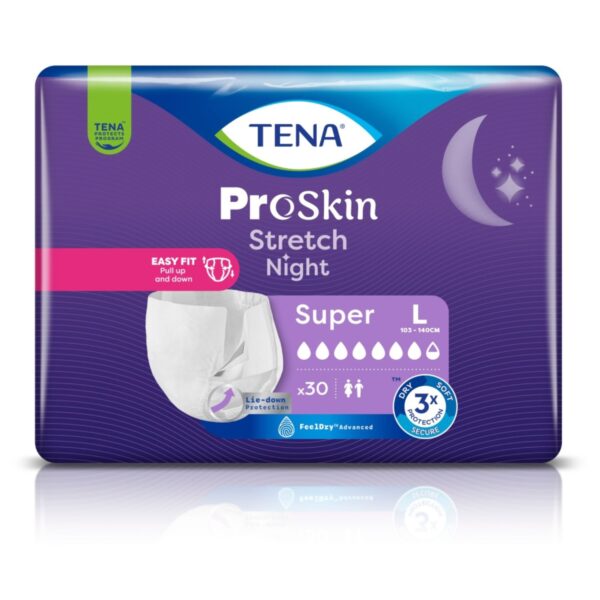 TENA Stretch ProSkin Super Night to nowoczesne majtki chłonne stworzone z myślą o komforcie i bezpieczeństwie podczas snu. Zapewniają wyjątkową chłonność, skuteczną ochronę przed przeciekaniem oraz poczucie suchości przez całą noc. Dzięki elastycznej konstrukcji i oddychającym materiałom doskonale dopasowują się do ciała, minimalizując ryzyko podrażnień skóry. Kompleksowa ochrona w średnim i ciężkim stopniu nietrzymania moczu. Szerokie elastyczne pasy boczne ułatwiające zakładanie.